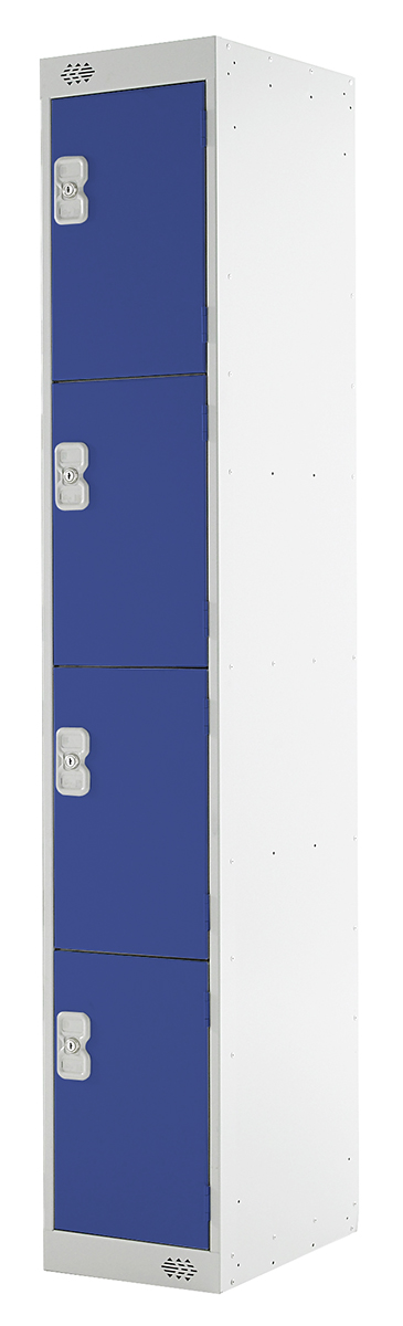 This is 4 Door Steel Blue Industrial Locker 1800 mm x 300 mm x 450mm manufactured by RS Pro. The manufacturer part number is 521-386. The product is made from highly stable and reliable steel.