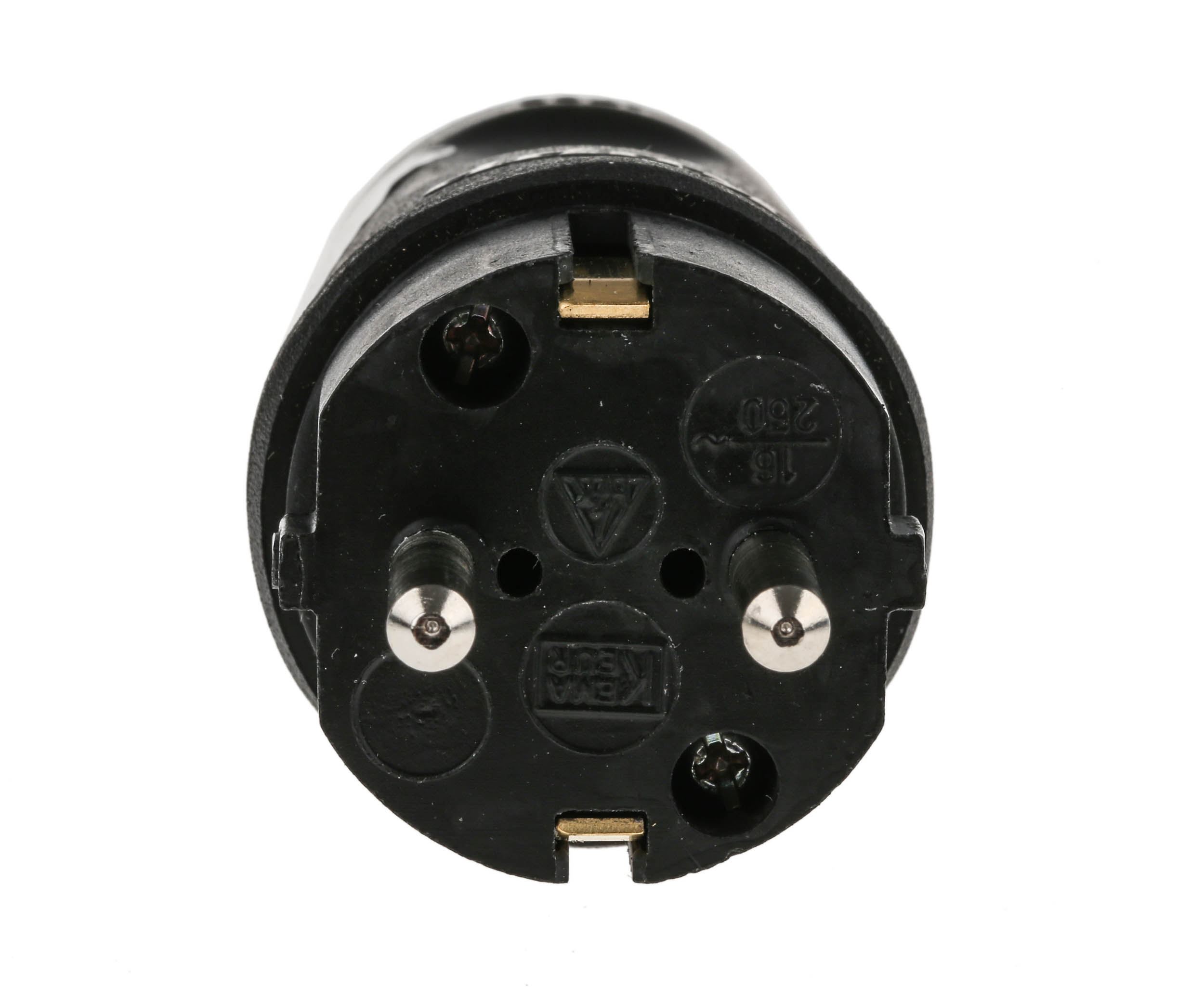 This is German Mains Plug Type F - German Schuko 16A Cable Mount 250 V ac manufactured by Kopp. The manufacturer part number is 1795.1600.9. The product has a current rating of 16a. The product is available in cable mount configuration. Moreover, the product has a nominal 250 v voltage rating. In addition, male is the available "Gender" of the product. The product's body is nicely designed from rubber materials.