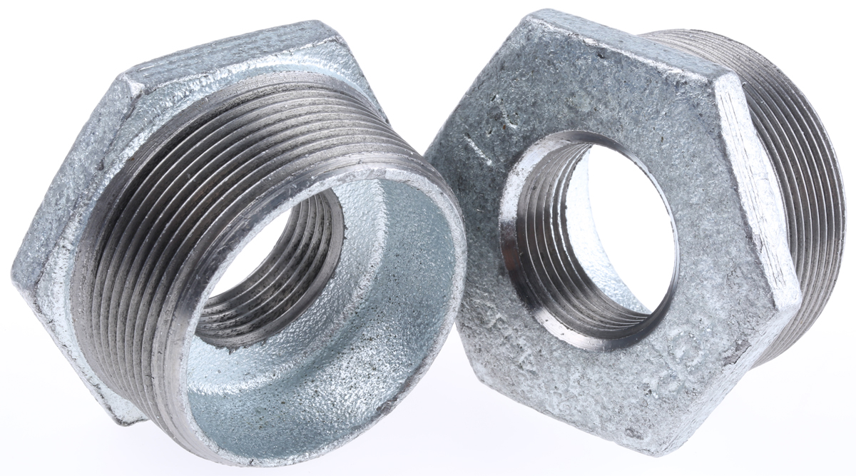 This is Malleable Iron Fitting Reducer Bush 2 in BSPT Male (Connection 1) 1 in BSPP Female (Connection 2) manufactured by Georg Fischer. The manufacturer part number is 770241239. A quality product with a nice galvanised finish.
