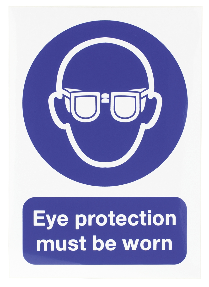 This is Vinyl Mandatory Eye Protection Sign with English Text 148 x 210mm manufactured by RS Pro. The manufacturer part number is 763-1689. The product is made from highly stable and reliable vinyl. In addition, the height is 210 mm. Furthermore, the product is 148mm wide.