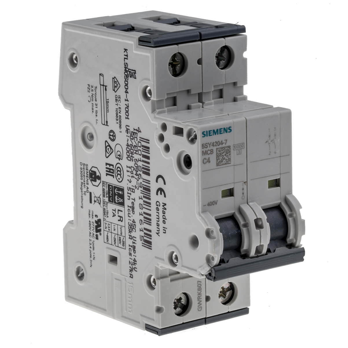 This is Sentron 5SY4 MCB Mini Circuit Breaker 2P 4 A 10 kA Curve C manufactured by Siemens. The manufacturer part number is 5SY4204-7. The product has a current rating of 4a. The product 5sy4, is a highly preferred choice for users. Its accurate length is 90mm. Furthermore, the product is 36mm wide. The product comes in 76mm depth. It has equipped with 2p poles. The product is available in din rail configuration. It is assigned with possible HTSUS value of 8536.20.0020. It is shipped in bulk. The product exhibits 400 v of AC voltage rating. 72 v of DC voltage rating. It is approved by ccc, ce, eac, imq, rcm, ur, vde. The product carries lever actuator. Is this product illuminated? none. It has a long 1 weeks standard lead time. It has equipped with 2 poles. Additionally, the product's output is 4a The product is designated with the ear99 code number