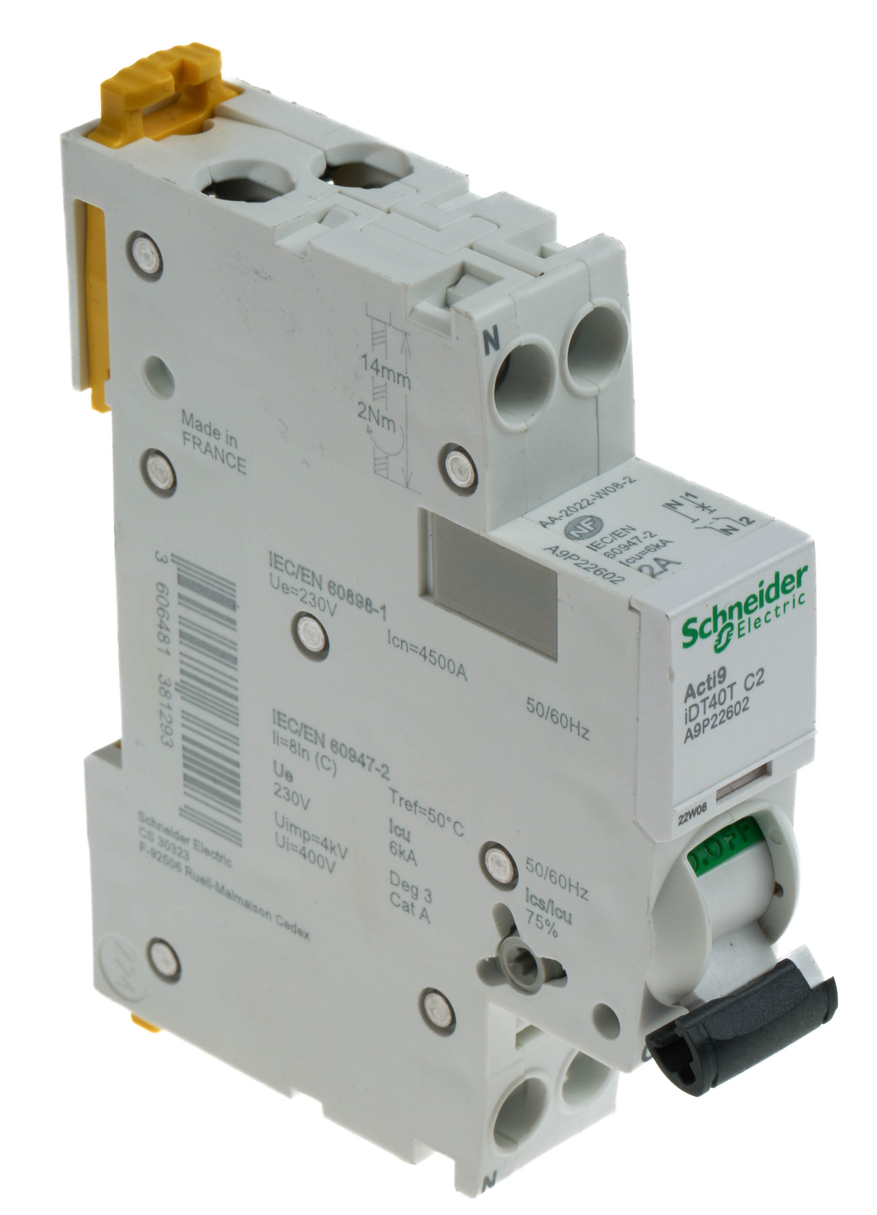 This is Acti9 MCB 1P+N 2 A 6 kA 4500 A Curve C manufactured by Schneider Electric. The manufacturer part number is A9P22602. The product has a current rating of 2a. The product acti9 idt40t, is a highly preferred choice for users. Its accurate length is 18mm. Furthermore, the product is 74mm wide. The product comes in 85mm depth. It has equipped with 1p+n poles.