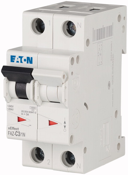 This is xEffect 3A MCB Mini Circuit Breaker Curve C Breaking Capacity 10 kA 240V manufactured by Eaton. The manufacturer part number is 278664 FAZ-C3/1N. The product has a current rating of 3a. The product eaton moeller, is a highly preferred choice for users. Its accurate length is 17.8mm. Furthermore, the product is 66mm wide. The product comes in 80mm depth. It has equipped with 1p+n poles.