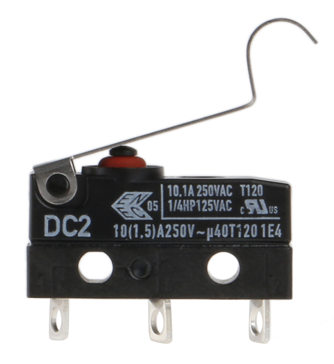 This is SPDT-NO/NC Simulated Roller Lever Microswitch 10.1 A @ 250 V ac manufactured by ZF. The manufacturer part number is DC2C-A1SC. It has a 1.27 n of operating force. Whereas, the minimum operating temperature of the product is -40°c. The product carries simulated roller lever actuator. The product also provide mechanical stability with 1000000operations. It has a maximum operating temperature of +120°c. The terminal is a solder type. The product is made from sturdy silver alloy materials.