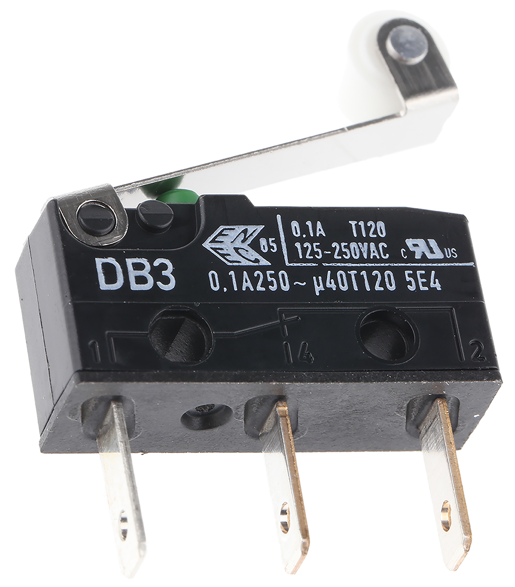 This is SPDT-NO/NC Roller Lever Microswitch 100 mA @ 30 V dc manufactured by ZF. The manufacturer part number is DB3C-B1RC. It has a 0.54 n of operating force. Whereas, the minimum operating temperature of the product is -40°c. The product carries roller lever actuator. The product also provide mechanical stability with 15000000operations. It has a maximum operating temperature of +120°c. The terminal is a tab type. The product is made from sturdy gold, silver alloy materials.