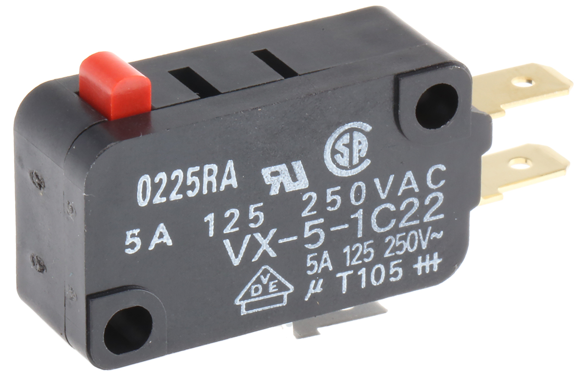 This is SPDT-NO/NC Pin Plunger Microswitch 5 A @ 250 V ac manufactured by Omron. The manufacturer part number is VX-5-1C22. It has a 0.25 n of operating force. Whereas, the minimum operating temperature of the product is -25°c. The product carries pin plunger actuator. The product also provide mechanical stability with 50000000operations. It carries a release force of 0.03n. It has a maximum operating temperature of +80°c. The terminal is a tab type. The product is made from sturdy silver alloy materials.