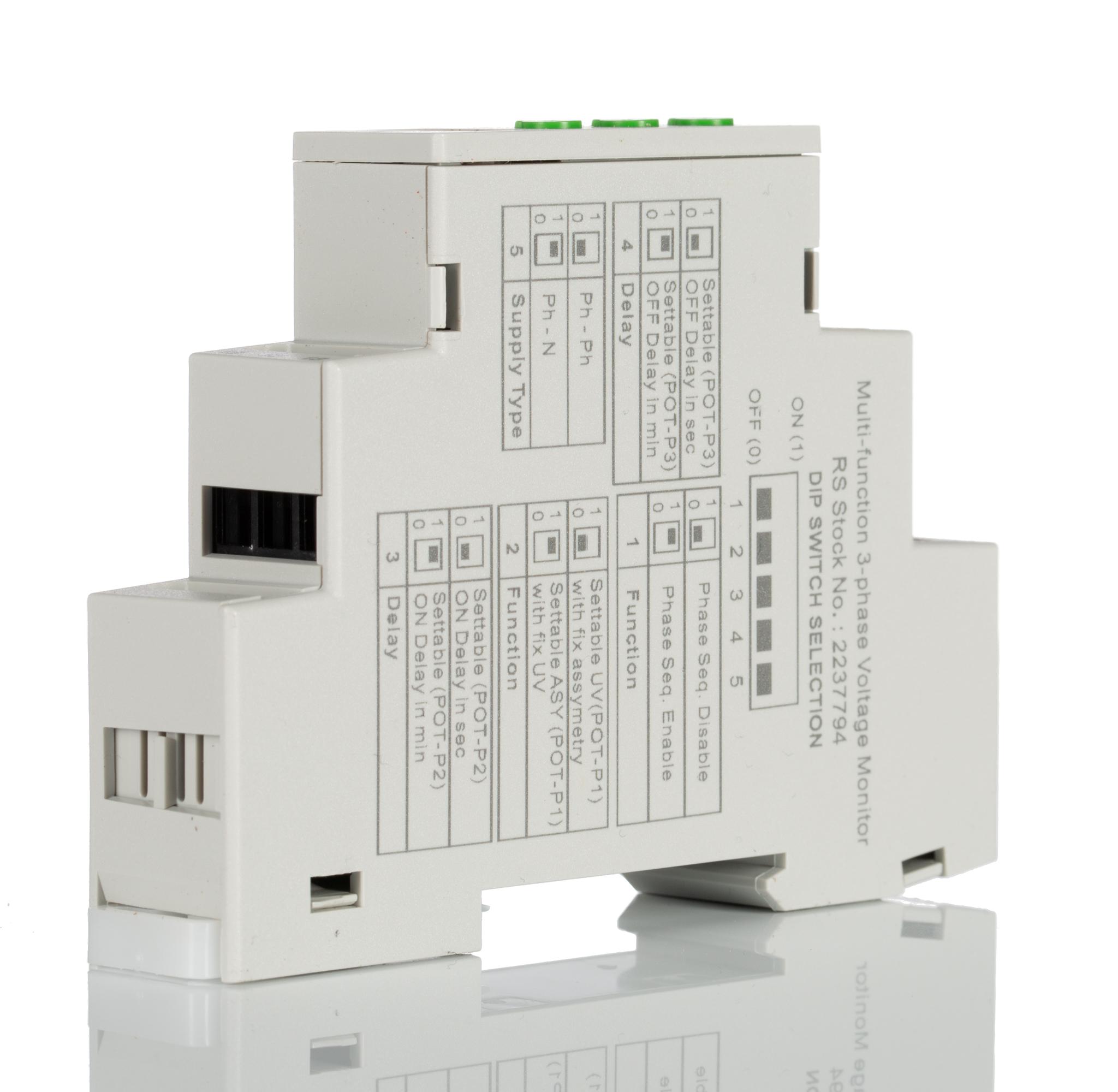 This is Phase Monitoring Relay With SPDT Contacts 3 Phase Overvoltage Protection Undervoltage Protection manufactured by RS PRO. The manufacturer part number is 223-7794. The given dimensions of the product include 17.5 x 90 x 66.5mm. The product is available in din rail configuration. Furthermore, the product is 90mm wide. Its accurate length is 66.5mm. Whereas, the minimum operating temperature of the product is -20°c. It has a maximum operating temperature of +60°c. The terminal is a screw type.