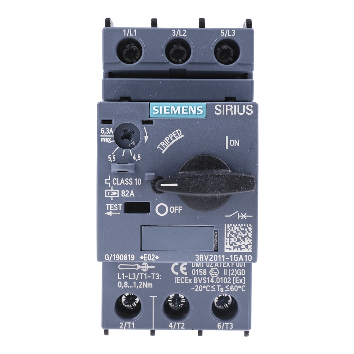 This is Sirius Innovation 690 V Motor Protection Circuit Breaker 3P Channels 4.5 → 6.3 A 6 kA manufactured by Siemens. The manufacturer part number is 3RV2011-1GA10. The product has a current rating of 4.5 → 6.3 a. The product 3rv2, is a highly preferred choice for users.