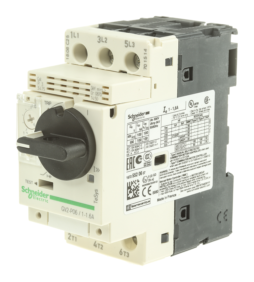 This is TeSys 690 V Motor Protection Circuit Breaker 3P Channels 1 → 1.6 A 100 kA manufactured by Schneider Electric. The manufacturer part number is GV2P06. The product has a current rating of 1 → 1.6 a. The product gv2p, is a highly preferred choice for users.