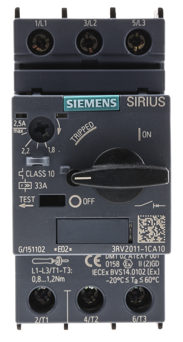 This is Sirius Innovation 690 V Motor Protection Circuit Breaker 3P Channels 1.8 → 2.5 A 10 kA manufactured by Siemens. The manufacturer part number is 3RV2011-1CA10. The product has a current rating of 1.8 → 2.5 a. Moreover, the product has a nominal 690 v voltage rating. The product 3rv2, is a highly preferred choice for users. Whereas, the minimum operating temperature of the product is -20°c. It has a maximum operating temperature of +60°c. It has equipped with 3 poles. The terminal is a screw type.