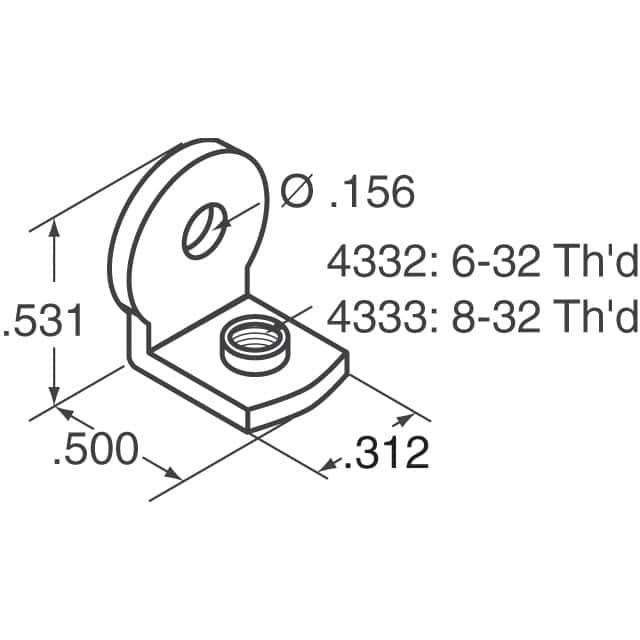 This is manufactured by Keystone Electronics. The manufacturer part number is 4333. The product is rohs3 compliant. It is assigned with possible HTSUS value of 7318.19.0000. It is shipped in bulk. The product is made from highly stable and reliable brass, nickel plated. Its typical moisture sensitivity level is 1 (unlimited). In addition, it is reach unaffected. It is a short l product with unique specifications. It has 0.156" (3.96mm), 8-32 screw, thread, or hole size. It has a long 14 weeks standard lead time. It comes in bracket, threaded hole(s) configuration. The product is designated with the ear99 code number