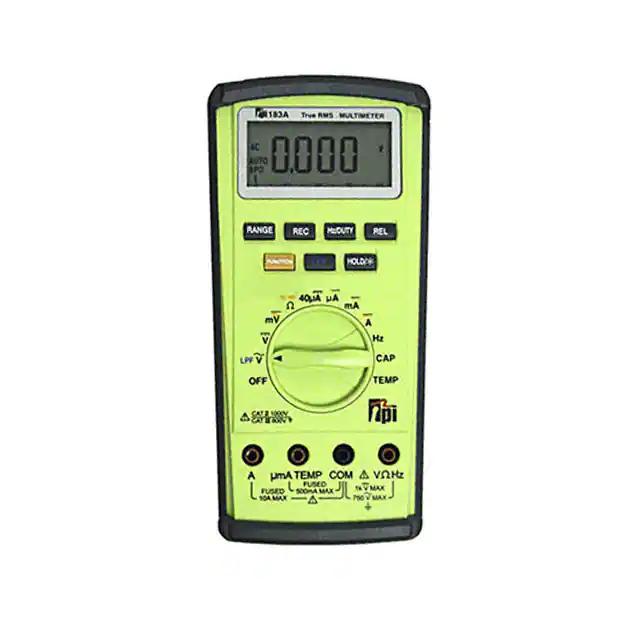 This is manufactured by TPI (Test Products Int). The manufacturer part number is 183A. It is rated with cat ii 1000v, cat iii 600v. Additionally, the product is designed with handheld Style. It is assigned with possible HTSUS value of 9030.31.0000. The product is rohs compliant. It comes in digital (dmm) configuration. It performs basic function of voltage, current, resistance, capacitance, temperature, frequency. In addition, it is reach unaffected. The product is also supplied with battery, boot, case, temperature probe, test leads. It is shipped in bulk. Its typical moisture sensitivity level is not applicable. It has a long 12 weeks standard lead time. It features a remarkable lcd, bar graph display. The splendid features of the product include auto off, backlight, hold, min/max. The product 183, is a highly preferred choice for users. The product is designated with the ear99 code number