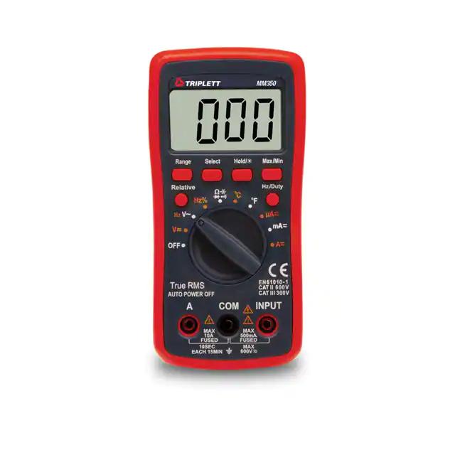 This is manufactured by Triplett. The manufacturer part number is MM350-NIST. It is rated with cat iii 600v. Additionally, the product is designed with handheld Style. It is assigned with possible HTSUS value of 9030.31.0000. The product is rohs3 compliant. It comes in digital (dmm) configuration. It performs basic function of voltage, current, resistance, capacitance, temperature, frequency. The product is also supplied with battery, certificate, temperature probe, test leads. It is shipped in retail package. Its typical moisture sensitivity level is not applicable. It features a remarkable lcd display. The splendid features of the product include auto off, hold, min/max, relative. Moreover, it corresponds to mm350, a base product number of the product. The product is designated with the ear99 code number