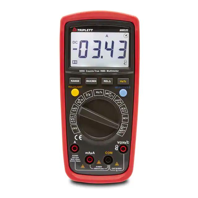 This is manufactured by Triplett. The manufacturer part number is MM520. It is rated with cat iii 600v. Additionally, the product is designed with handheld Style. It is assigned with possible HTSUS value of 9030.31.0000. The product is rohs3 compliant. It comes in digital (dmm) configuration. It performs basic function of voltage, current, resistance, capacitance, temperature, frequency. In addition, it is vendor undefined. The product is also supplied with battery, case, temperature probe, test leads. It is shipped in retail package. Its typical moisture sensitivity level is not applicable. It features a remarkable lcd display. The splendid features of the product include auto off, hold, min/max, relative. The product is designated with the ear99 code number
