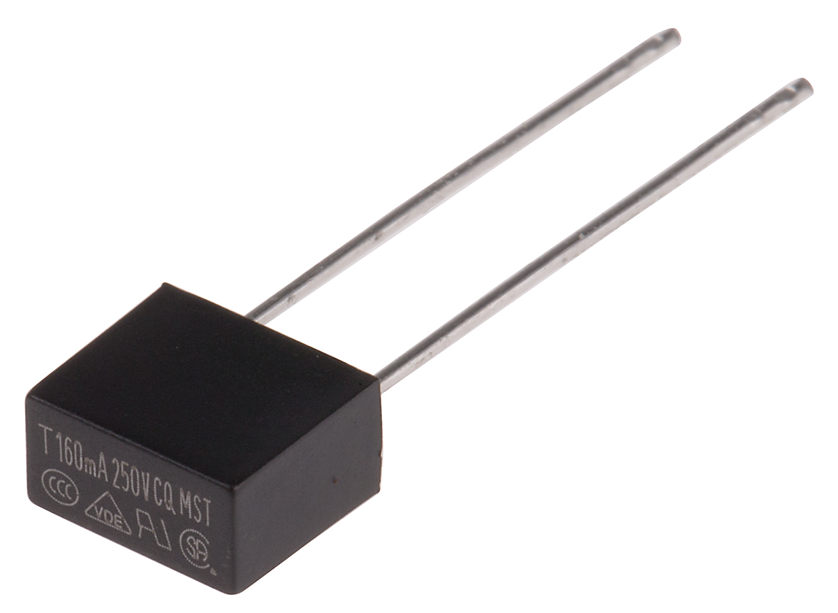 This is 160mA Radial Non-Resettable Wire Ended Fuse 250V manufactured by RS Pro. The manufacturer part number is 767-5014. The product has a current rating of 160ma. Whereas, the minimum operating temperature of the product is -55°c. Moreover, the product has a nominal 250v ac voltage rating. The product's body is nicely designed from thermoplastic materials. It has a maximum operating temperature of +125°c.