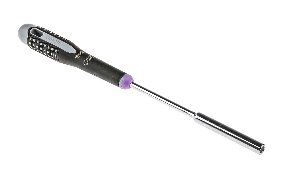 This is 125 mm Alloy Steel Ergonomic Nut Driver Hexagon Nut 5.5 mm Tip Bi-material manufactured by Bahco. The manufacturer part number is BE-7855. The built-in exquisite tip is a hexagon tip.