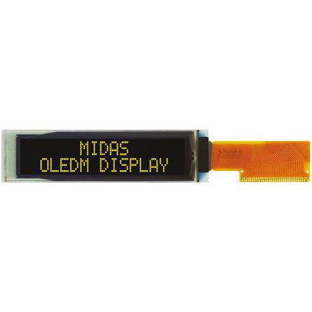 This is Yellow Passive matrix OLED Display TAB I2C Parallel SPI Interface manufactured by Midas. The manufacturer part number is MCOT21605AX-EYM. The given dimensions of the product include 68.5 x 17.5 x 2.0mm. It has a maximum operating temperature of +85°c. In addition, the height is 17.5mm. Furthermore, the product is 68.5mm wide. The product comes in 2.0mm depth. Whereas, the minimum operating temperature of the product is -40°c.
