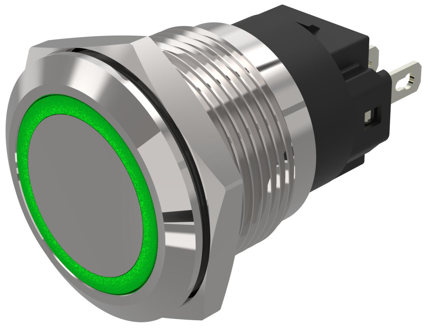 This is manufactured by EAO. The manufacturer part number is 82-5551.0134. Moreover, the product has a nominal 24v ac/dc voltage rating. The product 82, is a highly preferred choice for users. It is a type of led lamp. It is rated with ac/dc. It is assigned with possible HTSUS value of 8541.41.0000. The product is rohs3 compliant. Moreover, it has quick connect - 0.110" (2.8mm) terminal style. Features a 7ma current in A. It also has a 0.75" (19.00mm) dimensional features. It comes in led configuration. The product has a nice round shape. It comes in round with flat top lens style. In addition, it is reach unaffected. It has an attractive and classic green colour. It is shipped in tray. Its typical moisture sensitivity level is not applicable. It has a long 14 weeks standard lead time. It is IP rated with ip65, ip67. While its lens size is 22.00mm dia. It carries a 24v of voltage. The product is designated with the ear99 code number