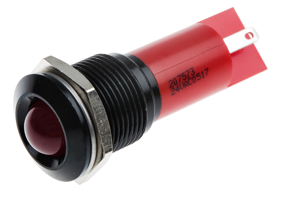 This is Red LED Indicator 24 V ac/dc 10 mm Lamp Size 16mm Mounting Hole Size manufactured by RS Pro. The manufacturer part number is 207-573. The product has a current rating of 20ma. Its accurate length is 62.5mm. It is a type of led lamp.