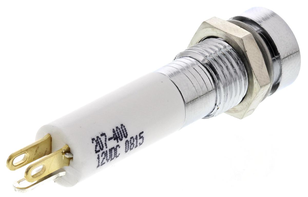 This is Green Red Yellow LED Indicator 12 V dc 5 mm Lamp Size 8mm Mounting Hole Size manufactured by RS Pro. The manufacturer part number is 207-400. The product is available in panel mount configuration. Moreover, the product has a nominal 12v dc voltage rating. Its accurate length is 34.8mm. The product has a current rating of 20ma. It is a type of led lamp.