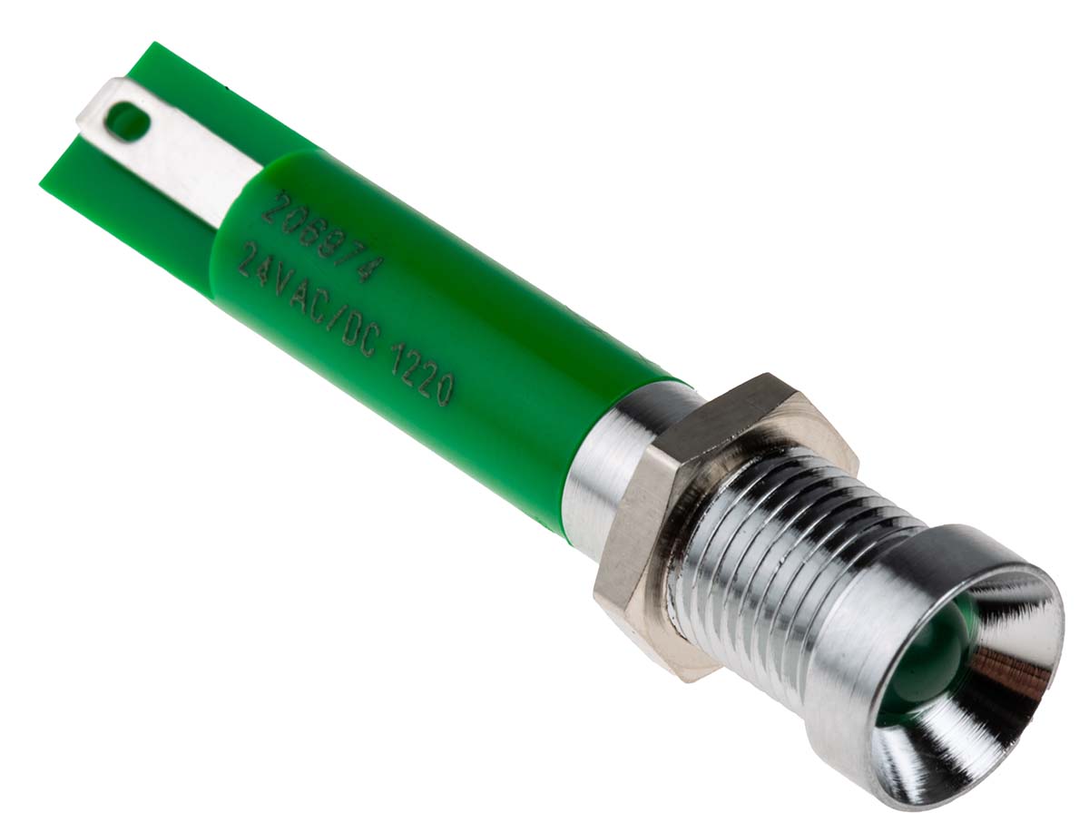 This is Recessed Indicator Panel Mount 8mm Mounting Hole Size Green LED Solder Tab Termination 5 mm Lamp Size 24 V ac manufactured by RS Pro. The manufacturer part number is 206-974. The product has a current rating of 20ma. Moreover, the product has a nominal 24v ac voltage rating. Its accurate length is 41mm. It is a type of led lamp.