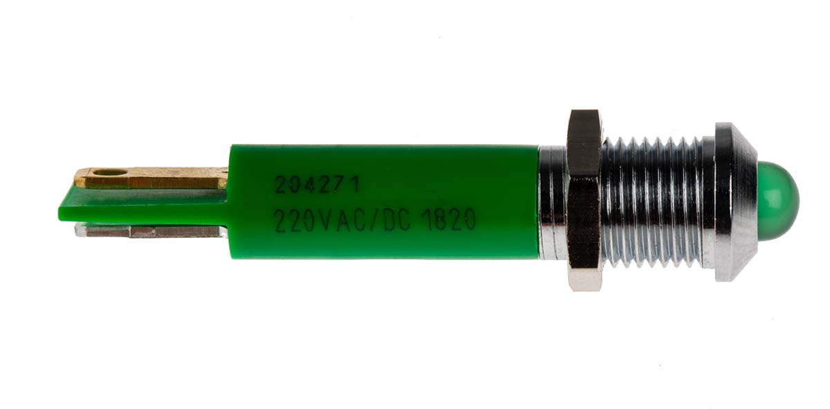 This is Green LED Indicator 230 V ac 5 mm Lamp Size 8mm Mounting Hole Size manufactured by RS Pro. The manufacturer part number is 204-271. The product has a current rating of 3ma. Moreover, the product has a nominal 230v ac voltage rating. Its accurate length is 40mm. It is a type of led lamp.