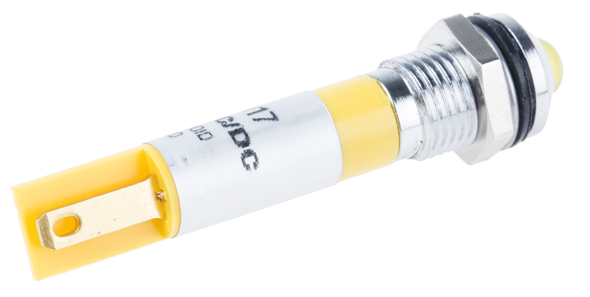 This is Yellow LED Indicator 110 V ac 5 mm Lamp Size 8mm Mounting Hole Size manufactured by RS Pro. The manufacturer part number is 203-802. The product has a current rating of 6ma. Moreover, the product has a nominal 110v ac voltage rating. Its accurate length is 40mm. It is a type of led lamp.