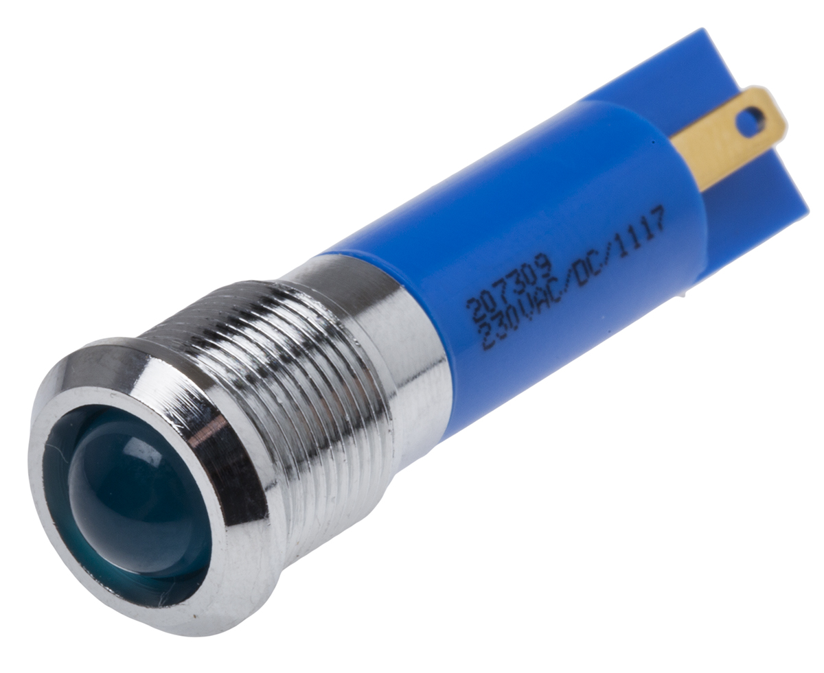 This is Prominent Indicator Panel Mount 12mm Mounting Hole Size Blue LED Tab Termination 8 mm Lamp Size 230 V ac manufactured by RS Pro. The manufacturer part number is 207-309. The product has a current rating of 3ma. Moreover, the product has a nominal 230v ac voltage rating. Its accurate length is 56mm. It is a type of led lamp.