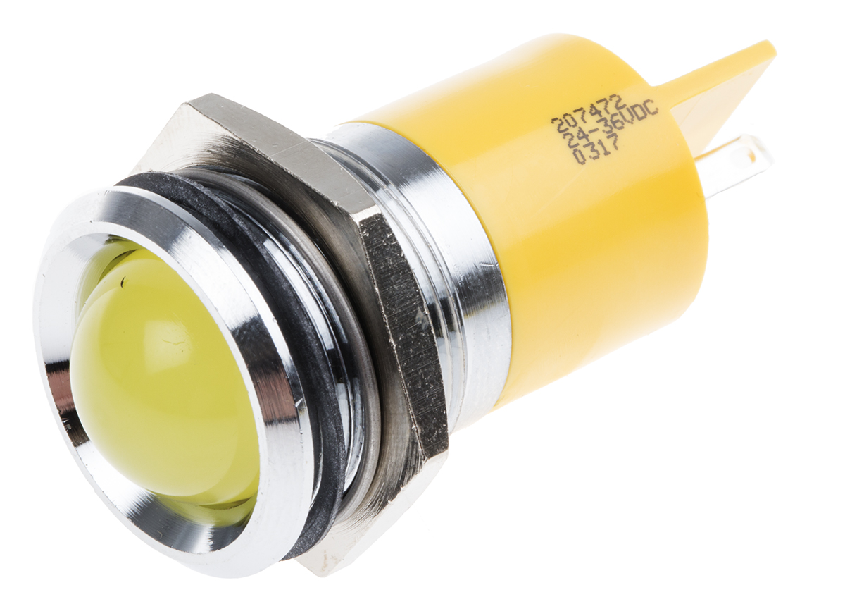 This is Yellow LED Indicator 24 → 36 V dc 16 mm Lamp Size 22mm Mounting Hole Size manufactured by RS Pro. The manufacturer part number is 207-472. The product has a current rating of 10ma. Moreover, the product has a nominal 24 → 36v dc voltage rating. Its accurate length is 61mm. It is a type of led lamp.
