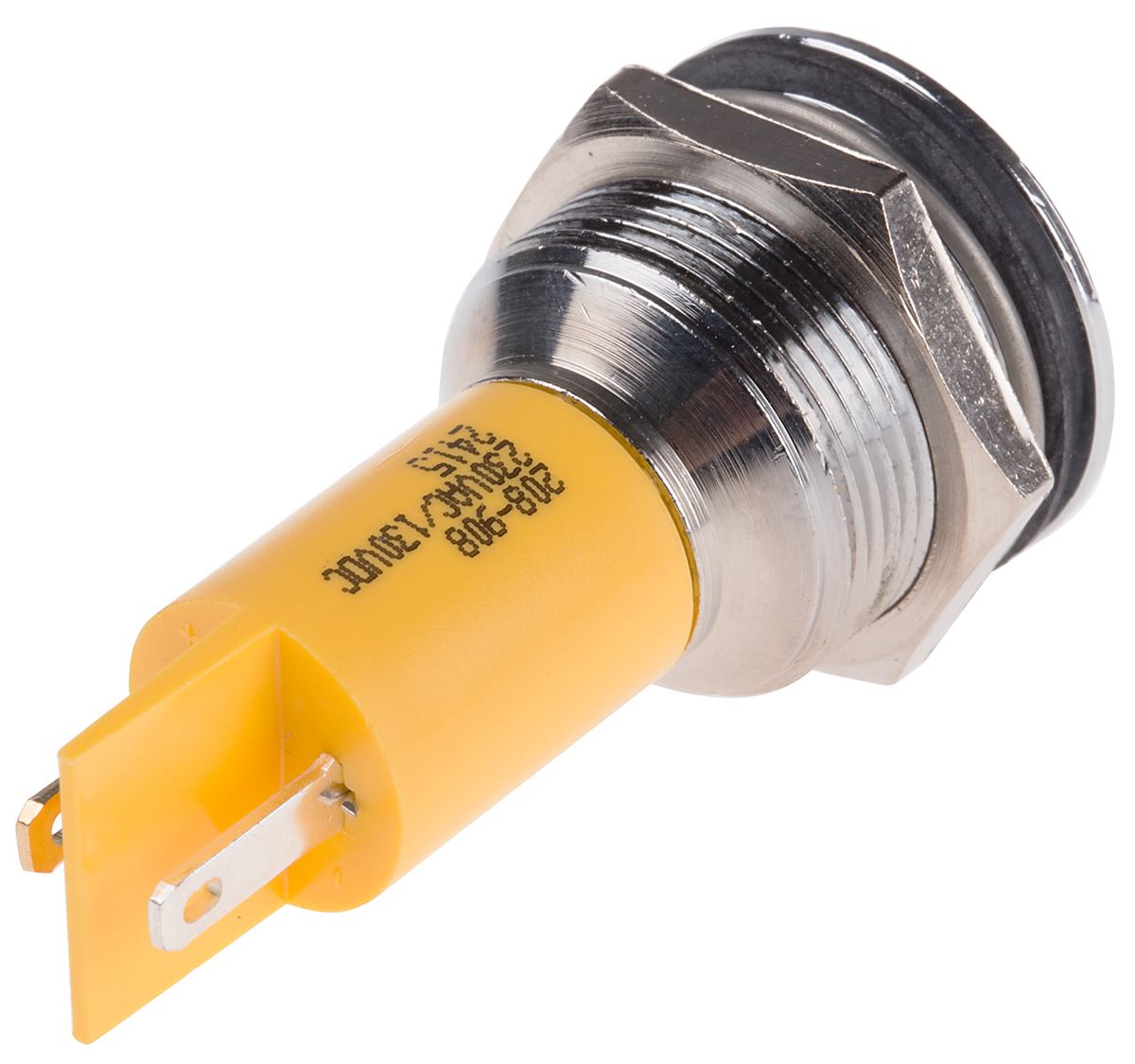 This is Yellow LED Indicator 130 V dc 230 V ac 10 mm Lamp Size 19mm Mounting Hole Size manufactured by RS Pro. The manufacturer part number is 208-908. The product has a current rating of 3ma. Moreover, the product has a nominal 130 v dc, 230v ac voltage rating. Its accurate length is 67.5mm. It is a type of led lamp.