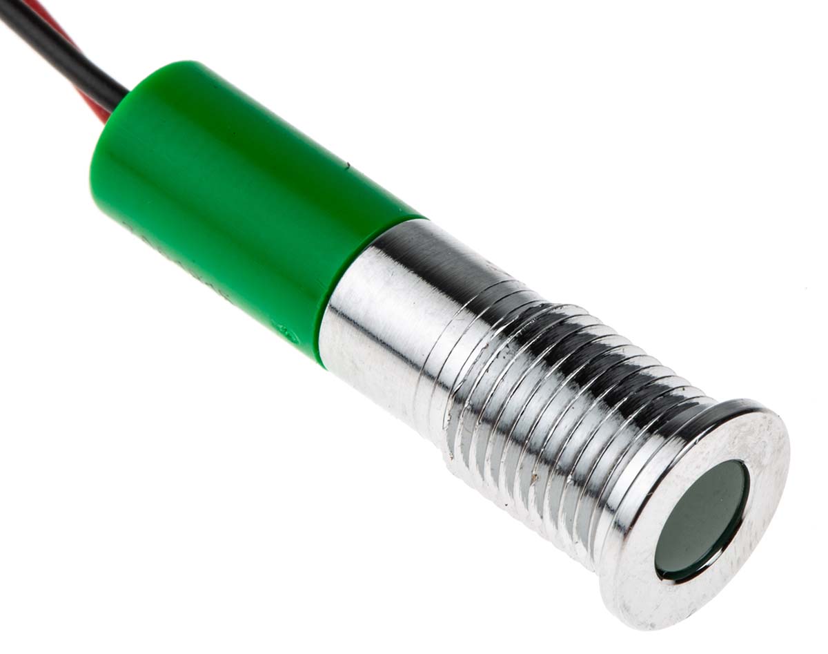 This is Flush Indicator Panel Mount 8mm Mounting Hole Size Green LED Lead Wires Termination 5 mm Lamp Size 12 V dc manufactured by RS Pro. The manufacturer part number is 700-1915. The product has a current rating of 20ma. Moreover, the product has a nominal 12v dc voltage rating. Its accurate length is 27.6mm. It is a type of led lamp.