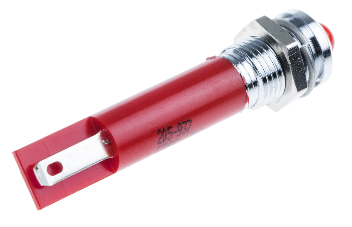 This is Prominent Indicator Panel Mount 8mm Mounting Hole Size Red LED Solder Tab Termination 5 mm Lamp Size 12 V ac manufactured by RS Pro. The manufacturer part number is 205-937. The product has a current rating of 20ma. Moreover, the product has a nominal 12v ac voltage rating. Its accurate length is 40mm. It is a type of led lamp.