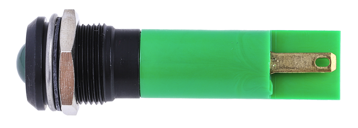 This is Prominent Indicator Panel Mount 12mm Mounting Hole Size Green LED Solder Tab Termination 8 mm Lamp Size 24 V ac/dc manufactured by RS Pro. The manufacturer part number is 209-068. The product has a current rating of 20ma. Its accurate length is 56mm. It is a type of led lamp.
