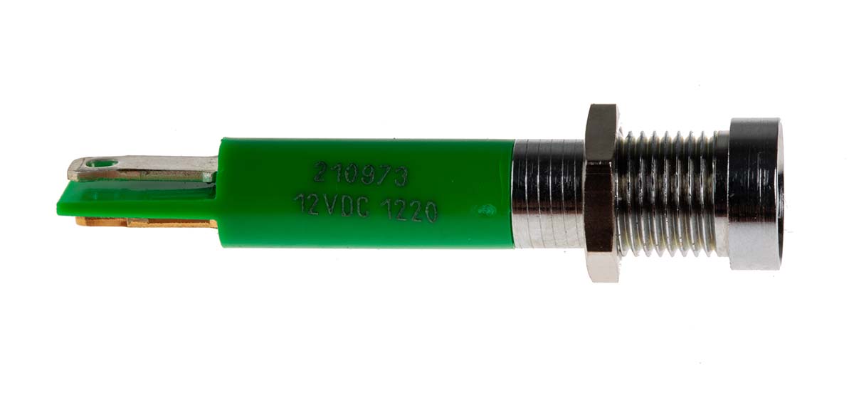 This is Recessed Indicator Panel Mount 8mm Mounting Hole Size Green LED Solder Tab Termination 5 mm Lamp Size 12 V dc manufactured by RS Pro. The manufacturer part number is 210-973. The product has a current rating of 20ma. Moreover, the product has a nominal 12v dc voltage rating. Its accurate length is 34.8mm. It is a type of led lamp.