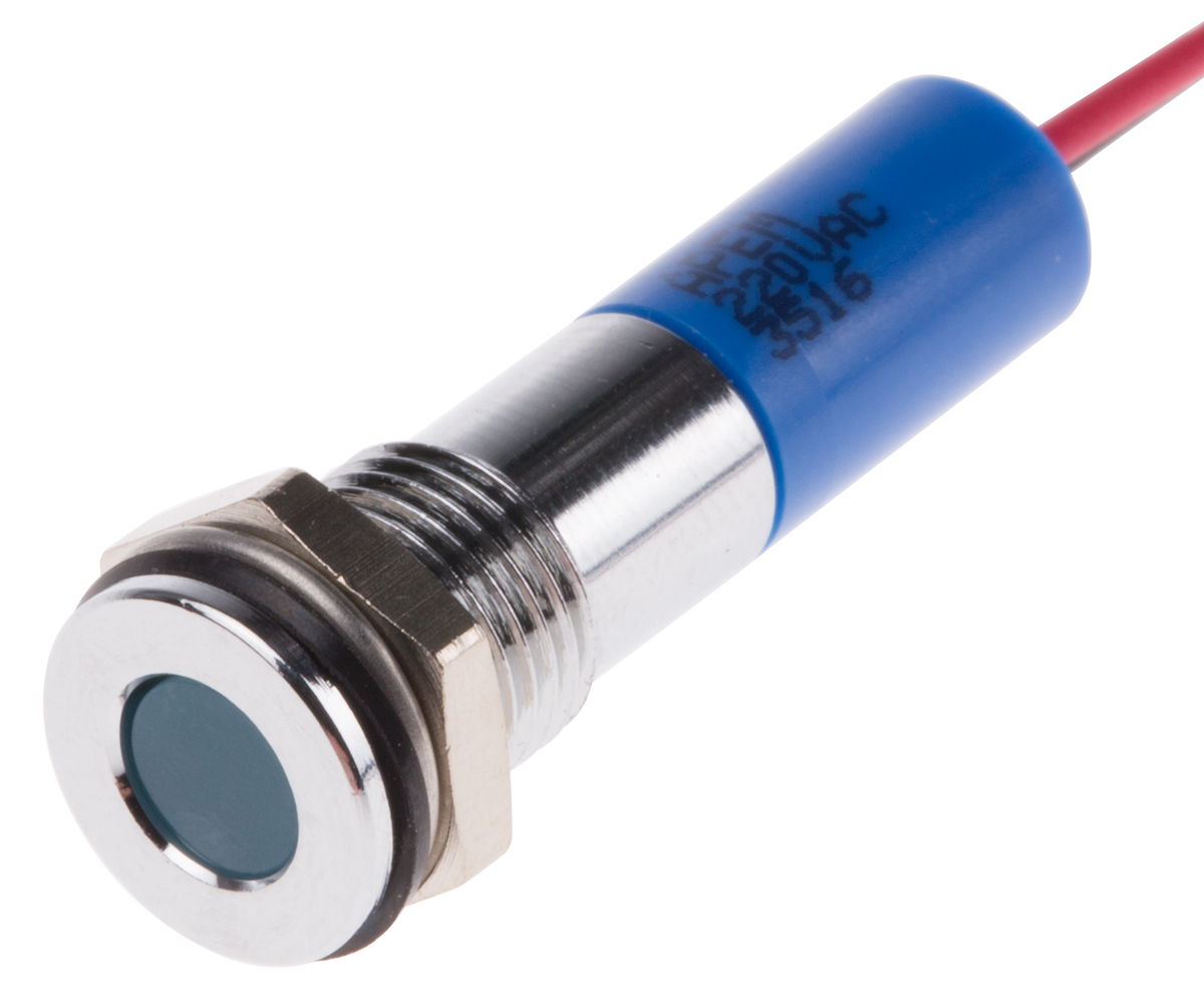 This is Blue LED Indicator 220 V ac 5 mm Lamp Size 8mm Mounting Hole Size IP67 manufactured by RS Pro. The manufacturer part number is 700-1959. The product has a current rating of 20ma. Moreover, the product has a nominal 220v ac voltage rating. Its accurate length is 27.6mm. It is a type of led lamp.