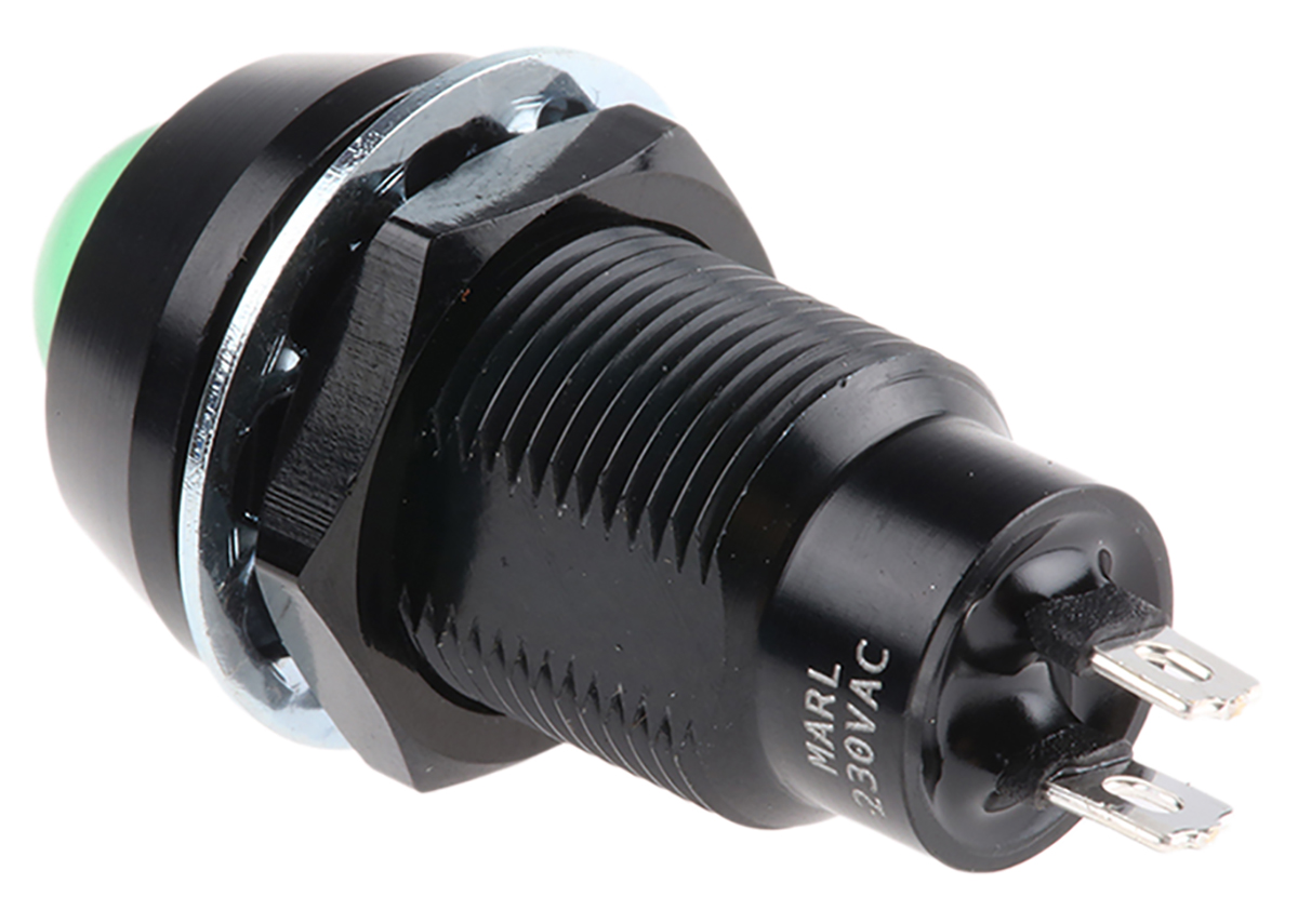 This is Prominent Indicator Panel Mount 12.7mm Mounting Hole Size Green LED Solder Tab Termination 10 mm Lamp Size manufactured by Marl. The manufacturer part number is 651-114-76. The product has a current rating of 4ma. Moreover, the product has a nominal 230v ac voltage rating. Its accurate length is 38.5mm. It is a type of led lamp.