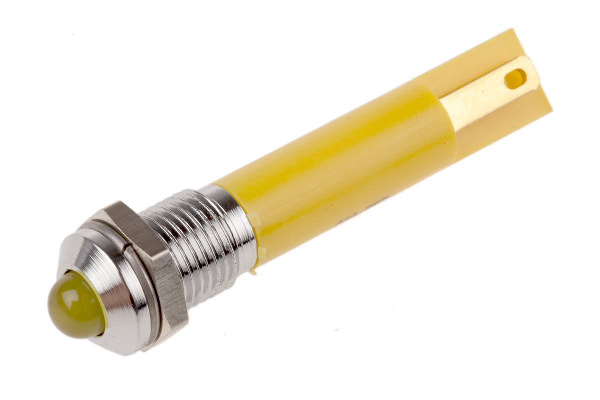 This is Yellow LED Indicator 12 V ac 5 mm Lamp Size 8mm Mounting Hole Size manufactured by RS Pro. The manufacturer part number is 210-557. The product has a current rating of 20ma. Moreover, the product has a nominal 12v ac voltage rating. Its accurate length is 40mm. It is a type of led lamp.