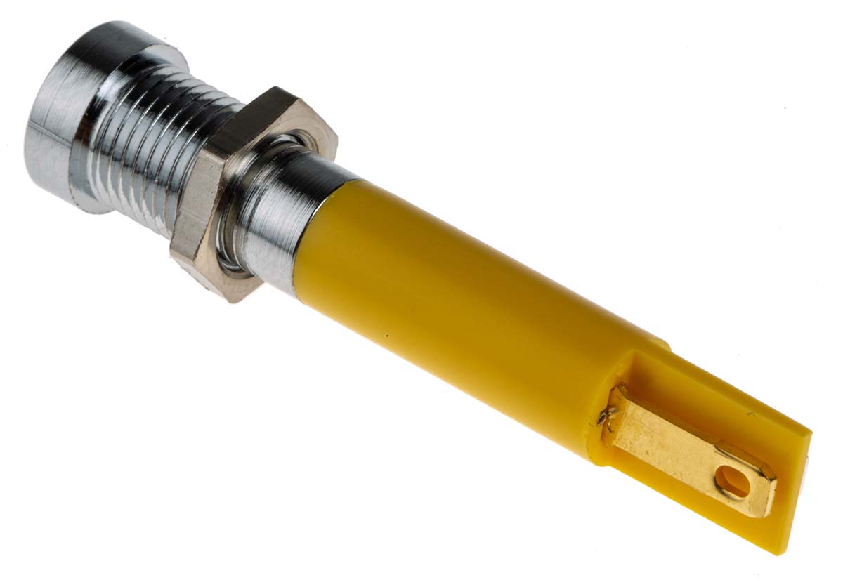 This is Recessed Indicator Panel Mount 8mm Mounting Hole Size Yellow LED Solder Tab Termination 5 mm Lamp Size 24 V dc manufactured by RS Pro. The manufacturer part number is 210-989. The product has a current rating of 20ma. Moreover, the product has a nominal 24v dc voltage rating. Its accurate length is 34.8mm. It is a type of led lamp.