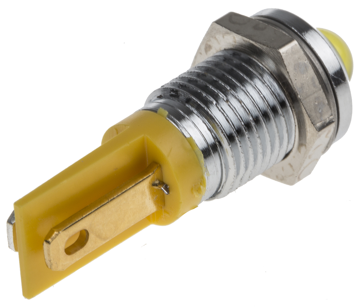This is Prominent Indicator Panel Mount 8mm Mounting Hole Size Yellow LED Solder Tab Termination 5 mm Lamp Size 2 V dc manufactured by RS Pro. The manufacturer part number is 209-901. The product has a current rating of 20ma. Moreover, the product has a nominal 2v dc voltage rating. Its accurate length is 25.5mm. It is a type of led lamp.