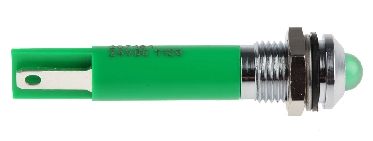 This is Green Indicator 24 V dc 5 mm Lamp Size 8mm Mounting Hole Size manufactured by RS Pro. The manufacturer part number is 207-191. The product has a current rating of 20ma. Moreover, the product has a nominal 24v dc voltage rating. Its accurate length is 33.9mm. It is a type of led lamp.