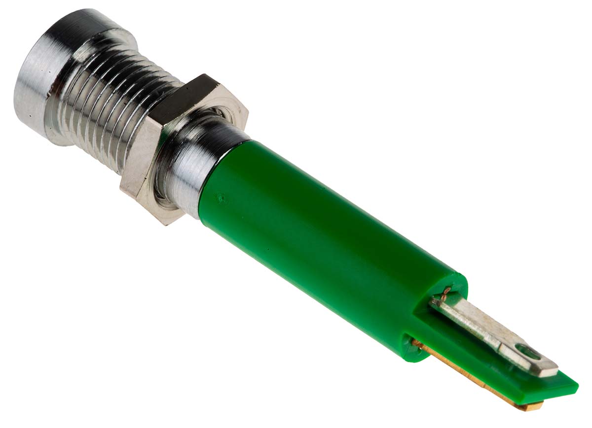 This is Green Indicator 24 V ac/dc 5 mm Lamp Size 8mm Mounting Hole Size IP67 manufactured by RS Pro. The manufacturer part number is 212-288. The product has a current rating of 20ma. Moreover, the product has a nominal 24v ac/dc voltage rating. Its accurate length is 41mm. It is a type of led lamp.