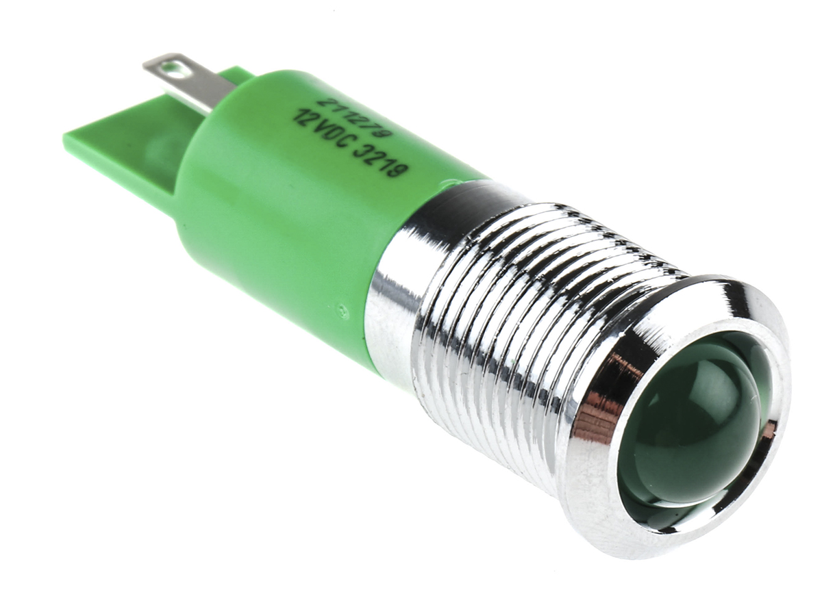 This is Green Indicator 12 V dc 10 mm Lamp Size 14mm Mounting Hole Size manufactured by RS Pro. The manufacturer part number is 211-279. The product has a current rating of 20ma. Moreover, the product has a nominal 12v dc voltage rating. Its accurate length is 47mm. It is a type of led lamp.