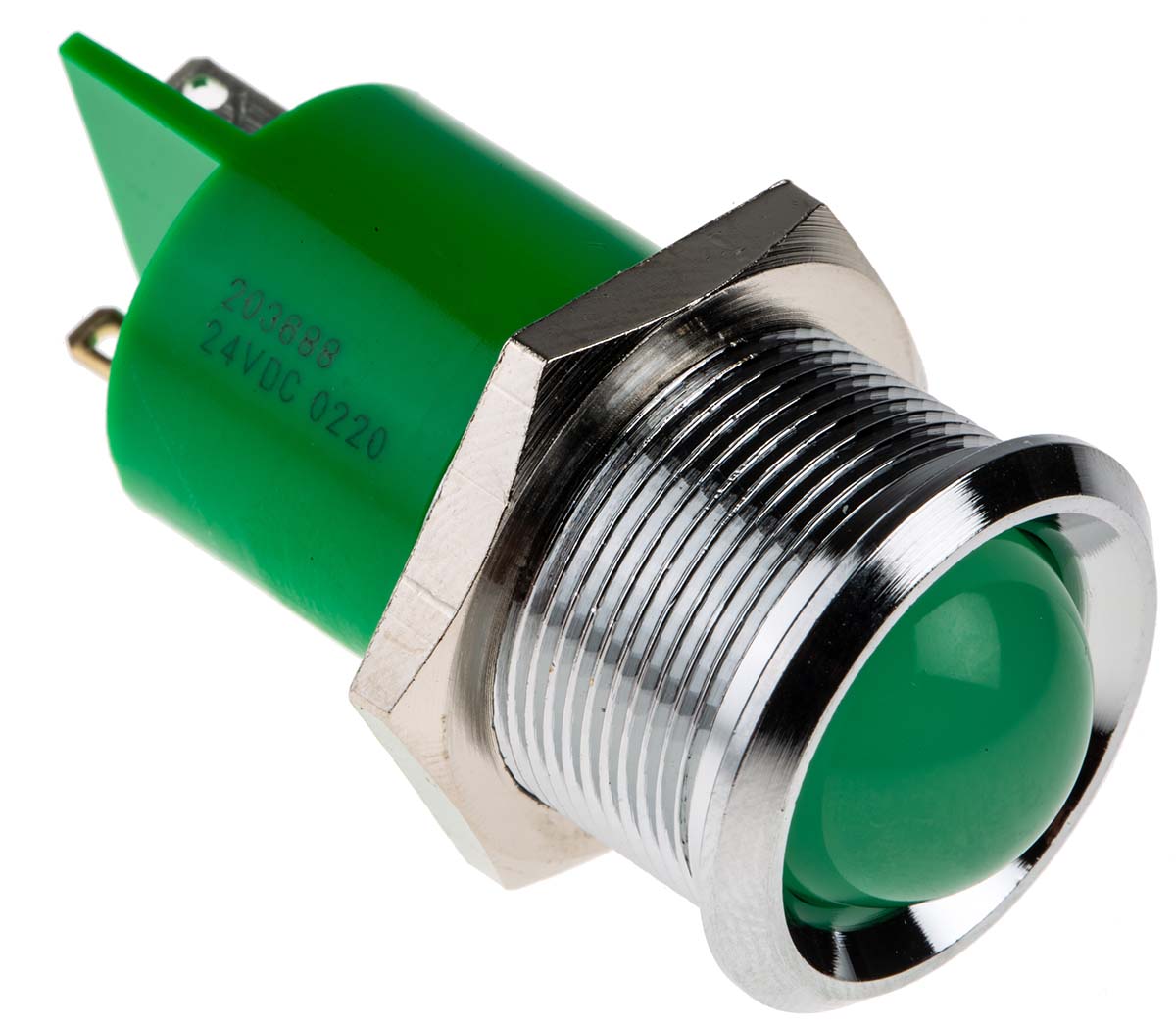 This is Green Indicator 24 V dc 18 mm Lamp Size 22mm Mounting Hole Size manufactured by RS Pro. The manufacturer part number is 203-688. The product has a current rating of 20ma. Moreover, the product has a nominal 24v dc voltage rating. Its accurate length is 61mm. It is a type of led lamp.