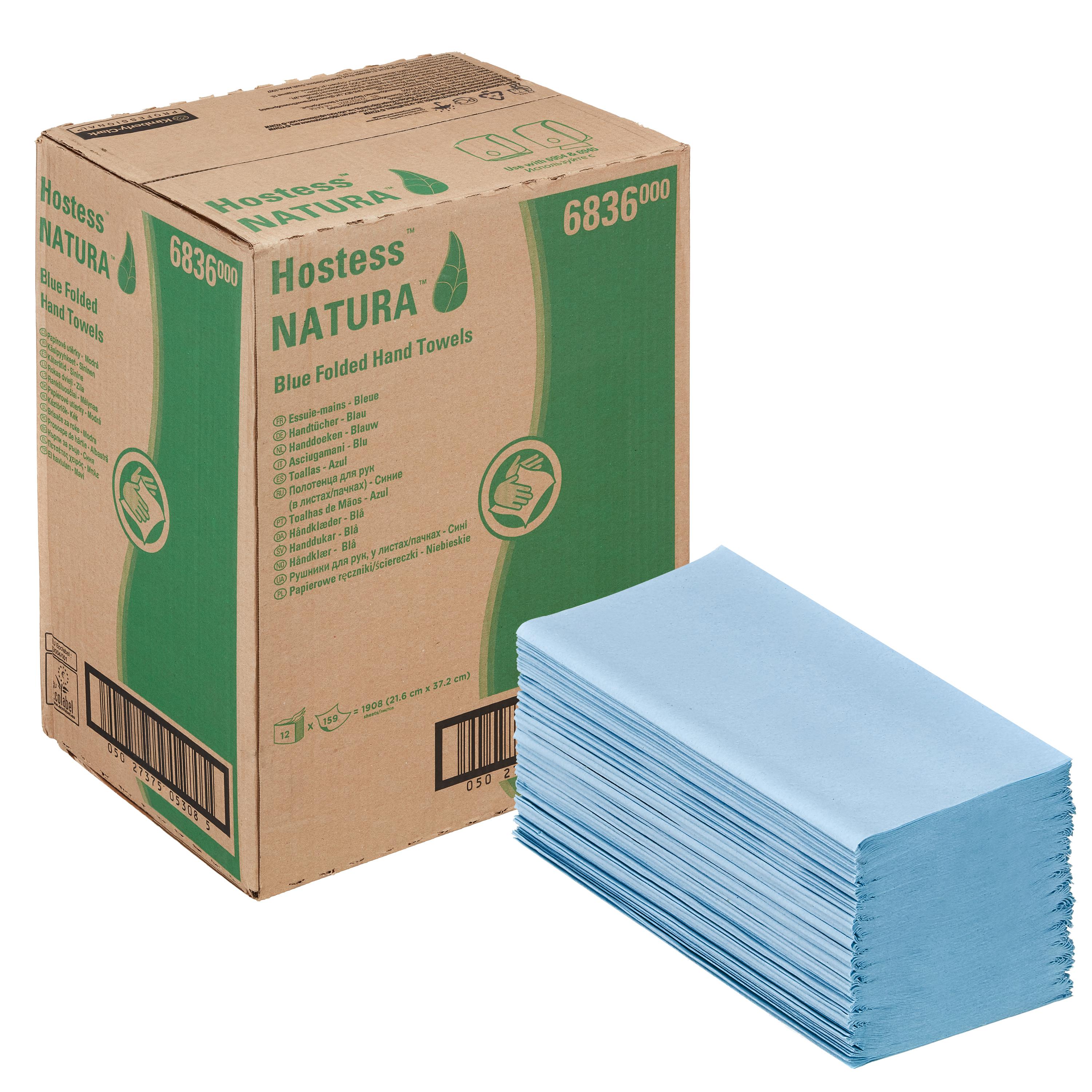 This is Hostess NATURA Hand Towels Folded Blue 372 x 216mm Paper Towel 1908 Sheets manufactured by Kimberly Clark. The manufacturer part number is 6836. In addition, 216mm is the Sheet Width of the product. The product is provided with 186mm length. It has a form factor of folded.