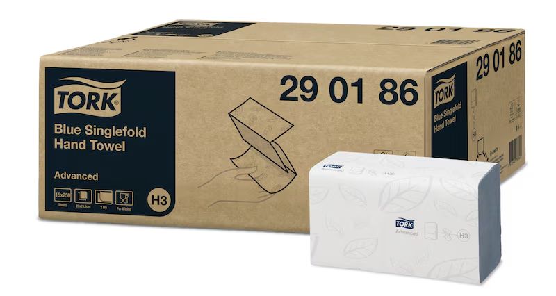 This is Folded Blue Paper Towel 230 x235mm 2-Ply 250 Sheets manufactured by Tork. The manufacturer part number is 290186. It has a form factor of folded.