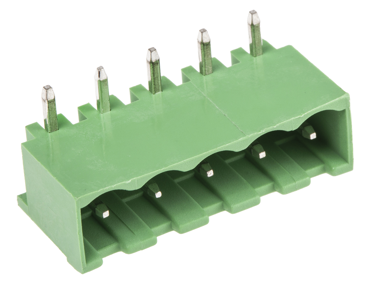 This is 5.08mm Pitch Right Angle PCB Terminal Block PCB Header PCB Mount 5 Way manufactured by RS Pro. The manufacturer part number is 897-1278. The product has a current rating of 15.0a. The product is available in through hole configuration. It comes in 1 of rows. Moreover, the product is 5.08mm The product contains 5 contacts.