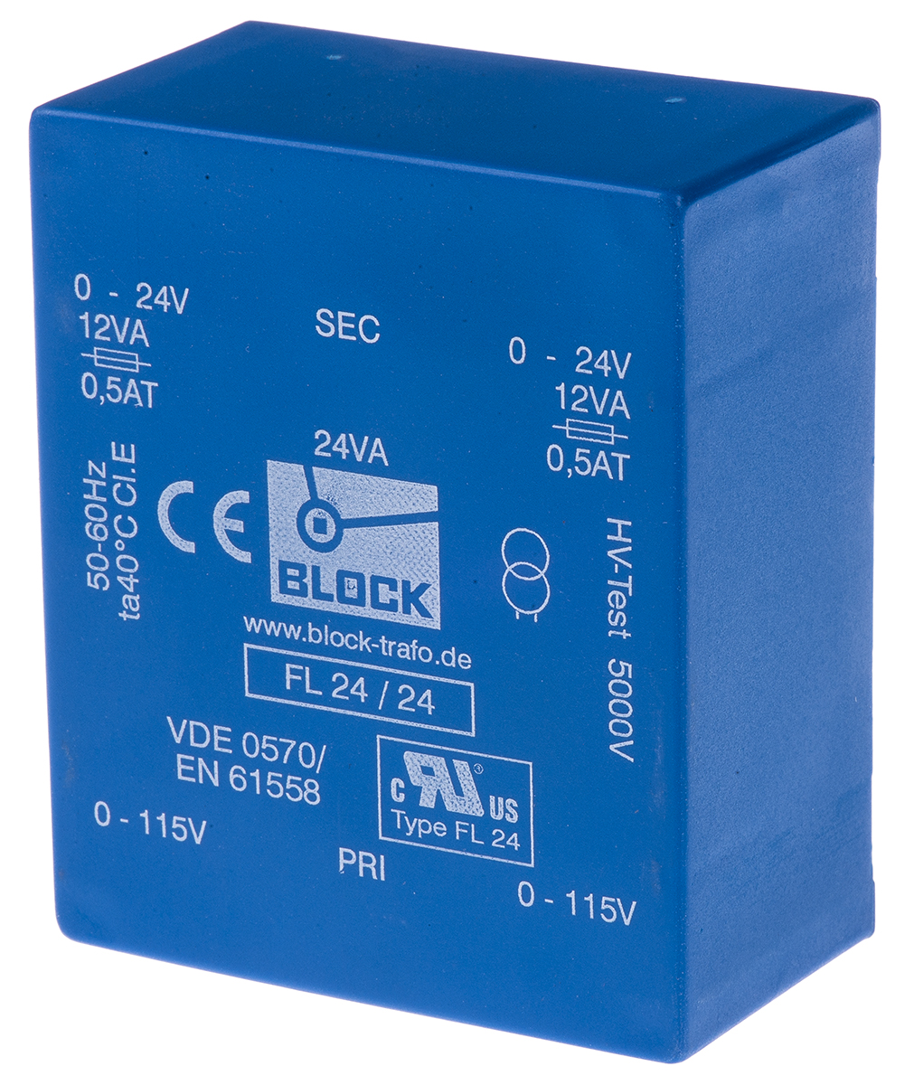 This is 24V ac 2 Output Through Hole PCB Transformer 24VA manufactured by Block. The manufacturer part number is FL 24/24. Additionally, the product is supplied with 2 outputs. The given dimensions of the product include 68 x 31.4 x 57mm. The typical product's weight is 445g. Its accurate length is 68mm. Furthermore, the product is 31.4mm wide. The product comes in 57mm depth. The product is available in through hole configuration.