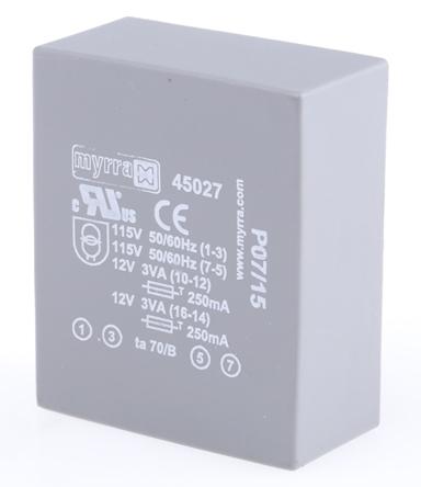 This is 12V ac 2 Output Through Hole PCB Transformer 6VA manufactured by Myrra. The manufacturer part number is 45027. Additionally, the product is supplied with 2 outputs. The given dimensions of the product include 53 x 44 x 22mm. The typical product's weight is 185g. Its accurate length is 53mm. Furthermore, the product is 44mm wide. The product comes in 22mm depth. The product is available in through hole configuration.