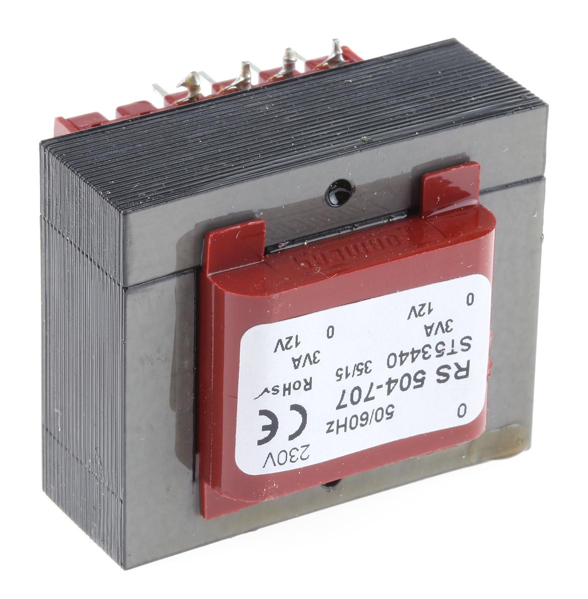 This is 12V ac 2 Output Through Hole PCB Transformer 6VA manufactured by RS Pro. The manufacturer part number is 504-707. Additionally, the product is supplied with 2 outputs. The given dimensions of the product include 43 x 36 x 33mm. The typical product's weight is 180g. Its accurate length is 43mm. Furthermore, the product is 36mm wide. The product comes in 33mm depth. The product is available in through hole configuration.