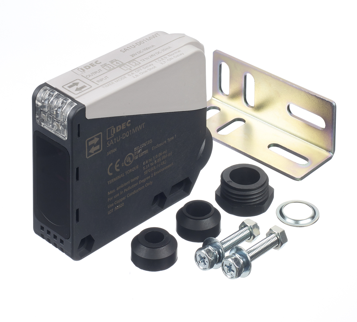 This is Photo Elect Diffuse 12-24VDC Relay OP manufactured by Idec. The manufacturer part number is SA1U-D01MWT. The product is available in flange mount configuration. The product sa1u, is a highly preferred choice for users. Furthermore, it has anpn/pnp output. The product also features robust pbt housing material. Whereas, the minimum operating temperature of the product is -25°c. It responds within 1 ms. It has a maximum operating temperature of +60°c. The terminal is a spring up type. Uses infrared as a light source.